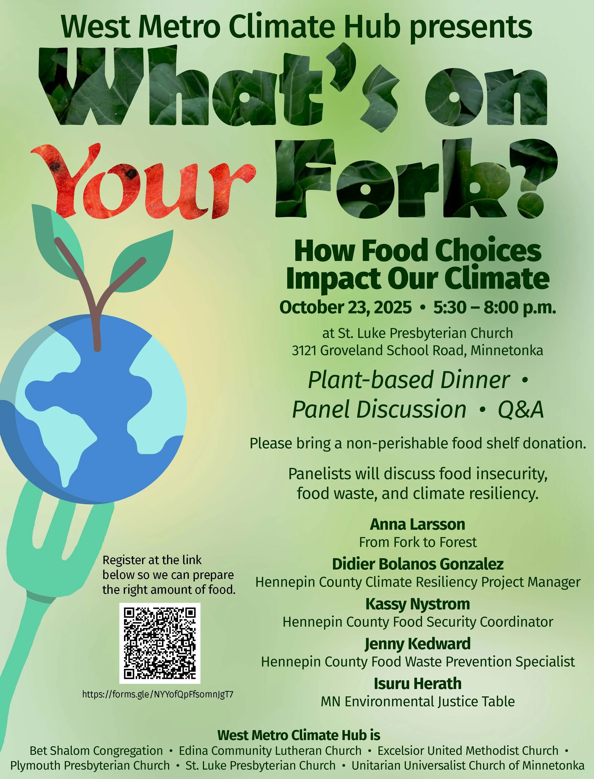 Join the West Metro Climate Hub at St. Luke for a plant-based dinner, followed by a panel discussion addressing food insecurity, food waste, and climate resiliency.