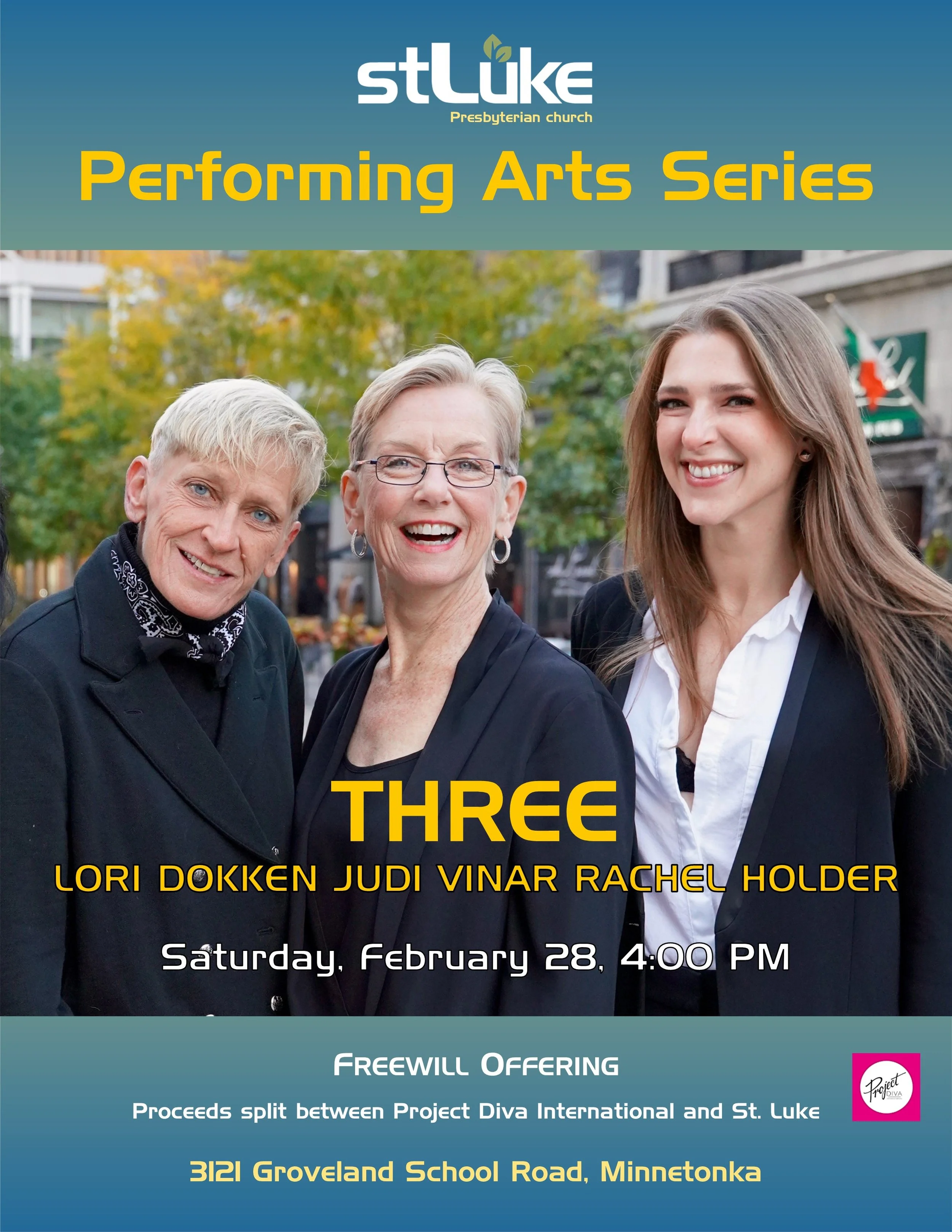 We welcome the return of the vocal group THREE – Lori Dokken, Judi Vinar, and Rachel Holder. Their concert a year ago of music of Carole King and Joni Mitchell was a rousing success, and the place was packed. Join us for another cozy afternoon of gorgeous singing! Admission is free. A freewill offering will be collected to support Project DIVA International, a mentoring program for middle- and high-school-age Black girls.