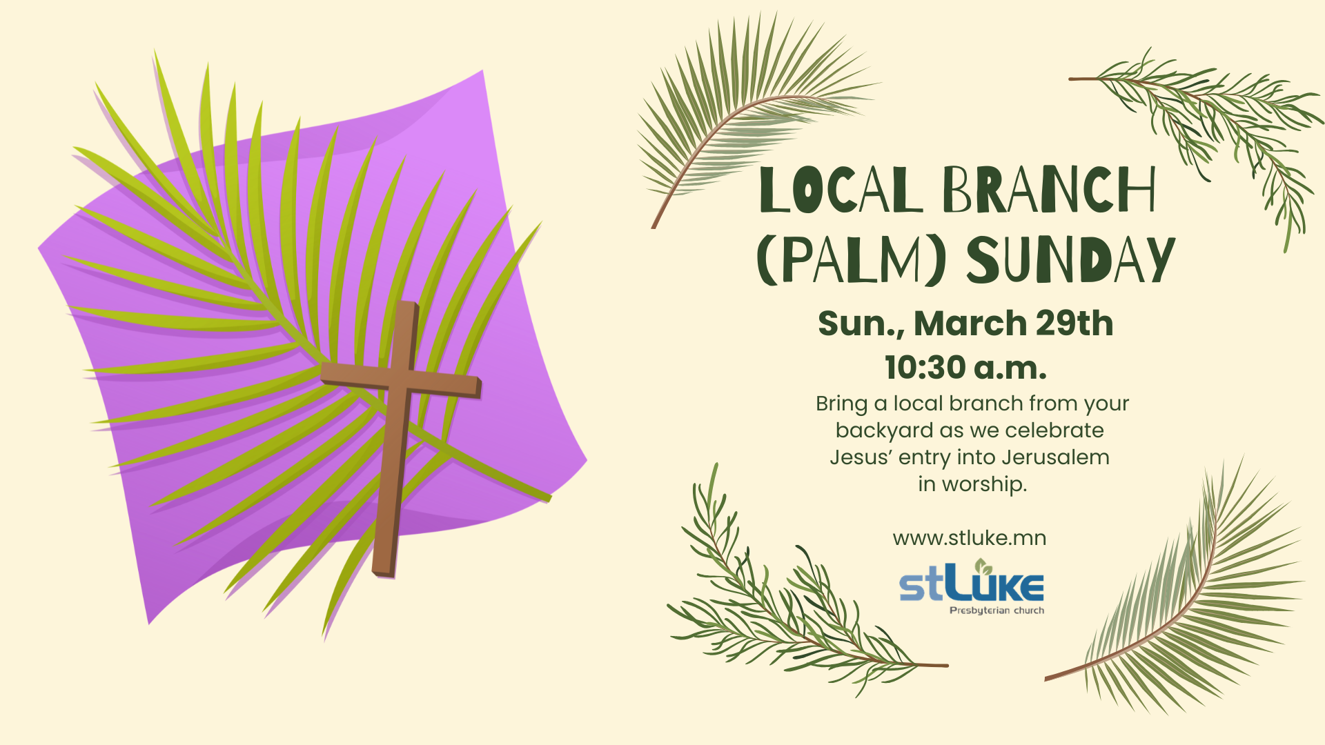 Join us as we celebrate Jesus’ radical entry into Jerusalem. During worship, we will have a local branch (palm) parade. Please bring a branch from your backyard to join in the festivities.